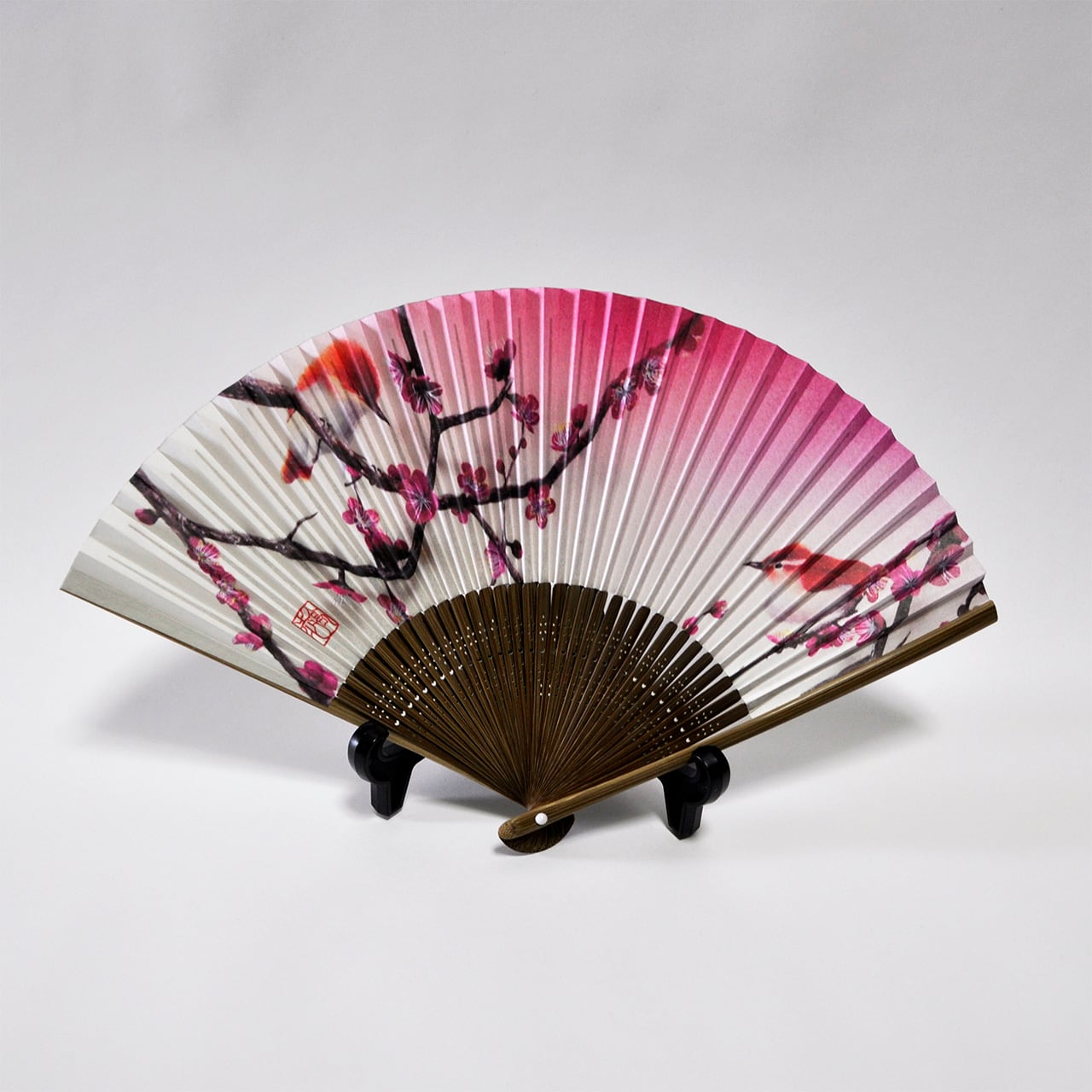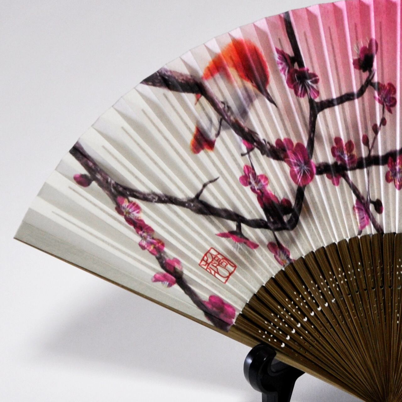 出現シリーズ「梅」の絵柄が入った扇子です。 京都の扇子職人さん制作。 扇面には光沢のある和紙、扇骨には竹を使用。 化粧箱には大西高志の落款入り。 長 さ : 約22cm 開いた時の横幅:約38.5cm